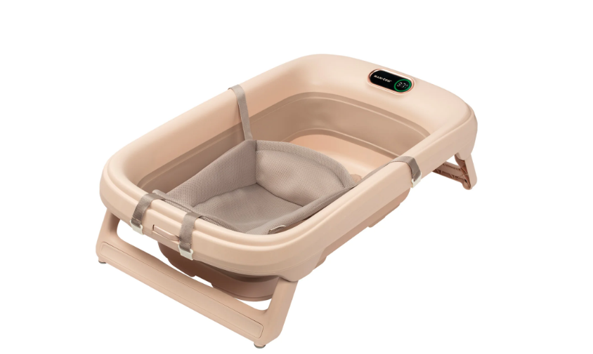 A estrutura dobra em segundos e permite guardar a banheira em espaços pequenos, e o gancho retrátil torna o armazenamento ainda mais prático.
