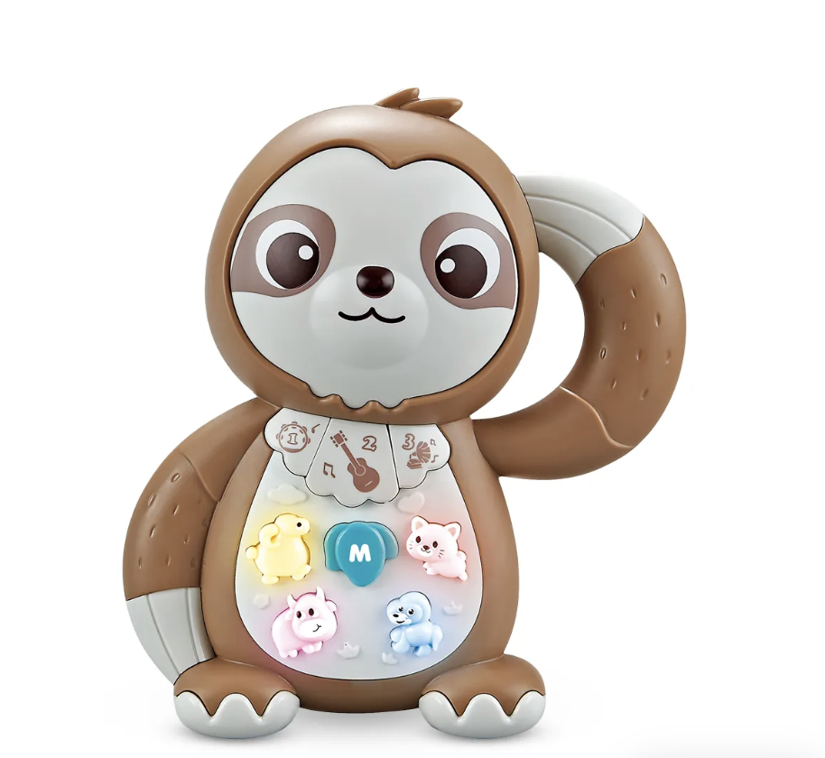 O bicho-preguiça musical possui botões em formato de bichinhos que ascendem quando pressionados, tocam músicas e imitam o barulho dos animais. Desenvolve a concentração, a audição e a percepção de cores pela criança. Medidas:15,5x3,4x16,5cm