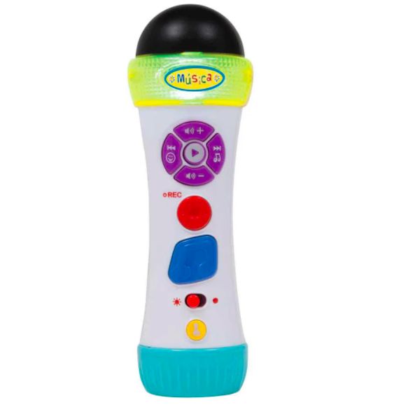 O Microfone é um produto fantástico para seu pequeno. Com musicas e efeitos sonoros, ele tem função volume, luzes multicoloridas, lanterna na parte inferior, e grava e reproduz a voz.