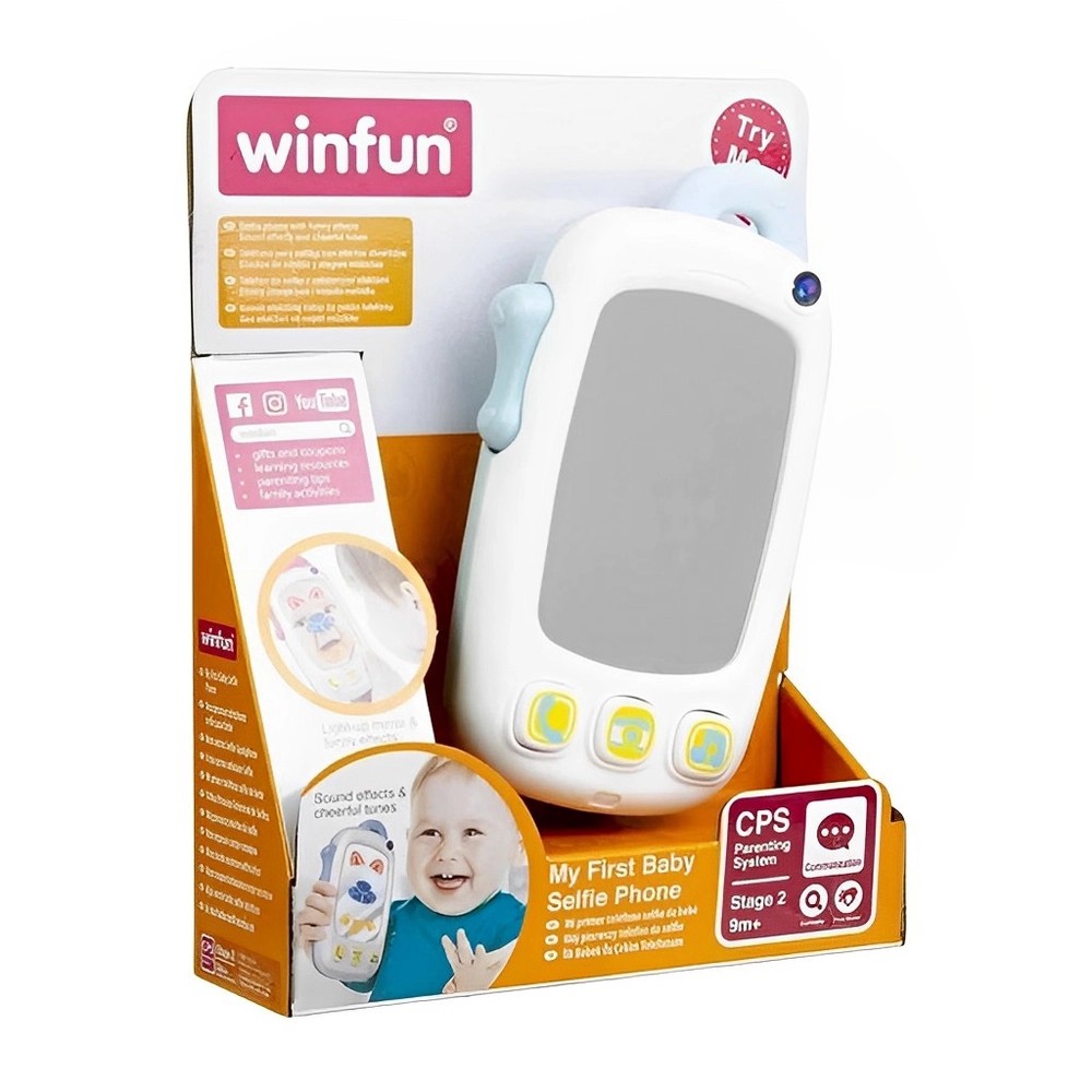 Meu Primeiro telefone possui botões fáceis de pressionar e espelho iluminado. Pressione o ícone da câmera para ver efeitos engraçados. Inclui frases, efeitos sonoros e melodias alegres. Pressione o botão lateral para sons de clique-clac.