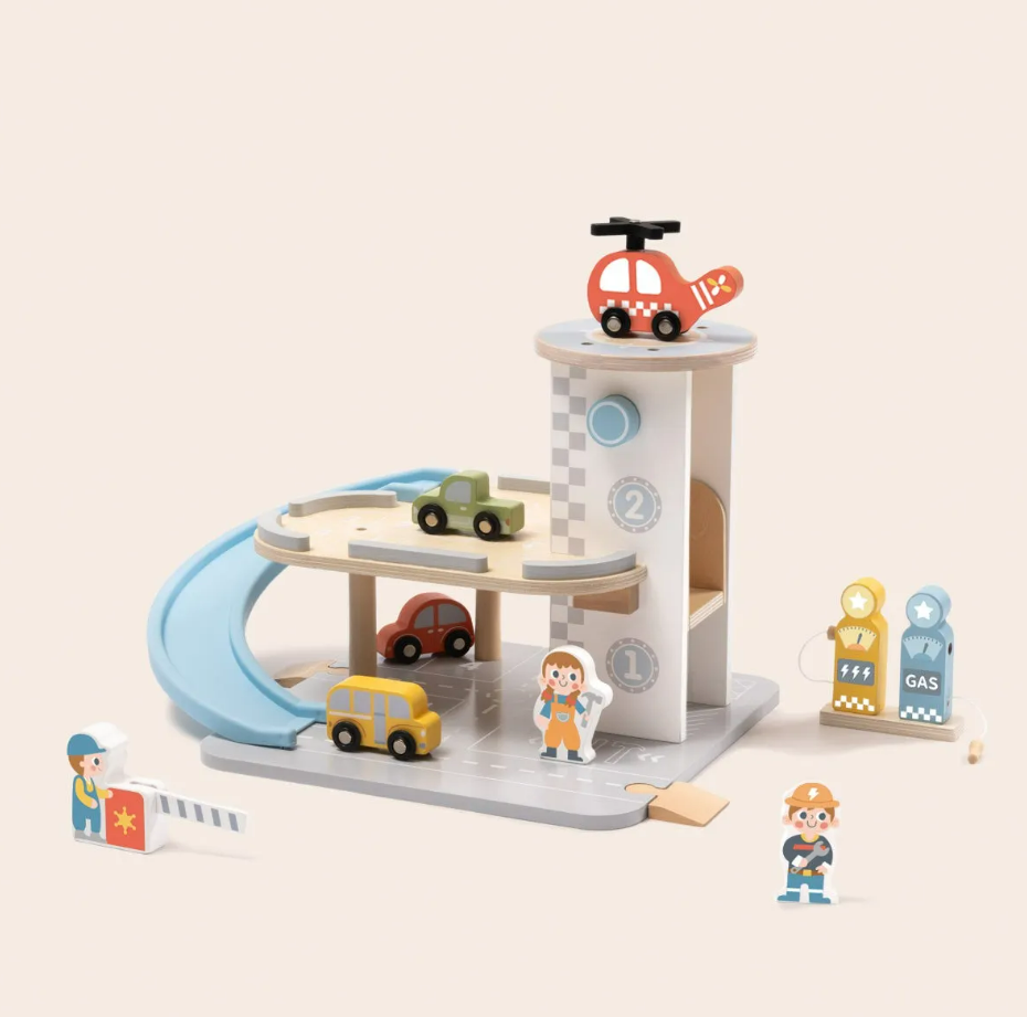 Brinquedo de Madeira - ESTACIONAMENTO E GARAGEM - TOOKY TOY Prepare-se para embarcar em uma aventura cheia de movimento, imaginação e descobertas com o Estaciona & Brinca – Tooky Toy.