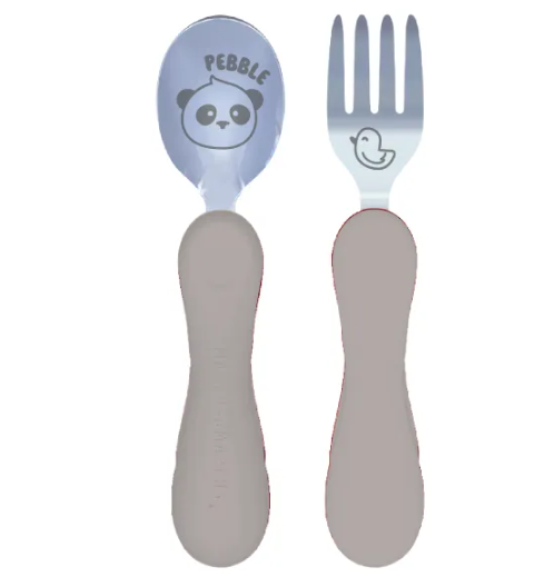 Jogo Anatômico Colher e Garfo em Silicone e Inox 2 pçs Panda Pebble Cinza Claro (com Case) Marcus & Marcus