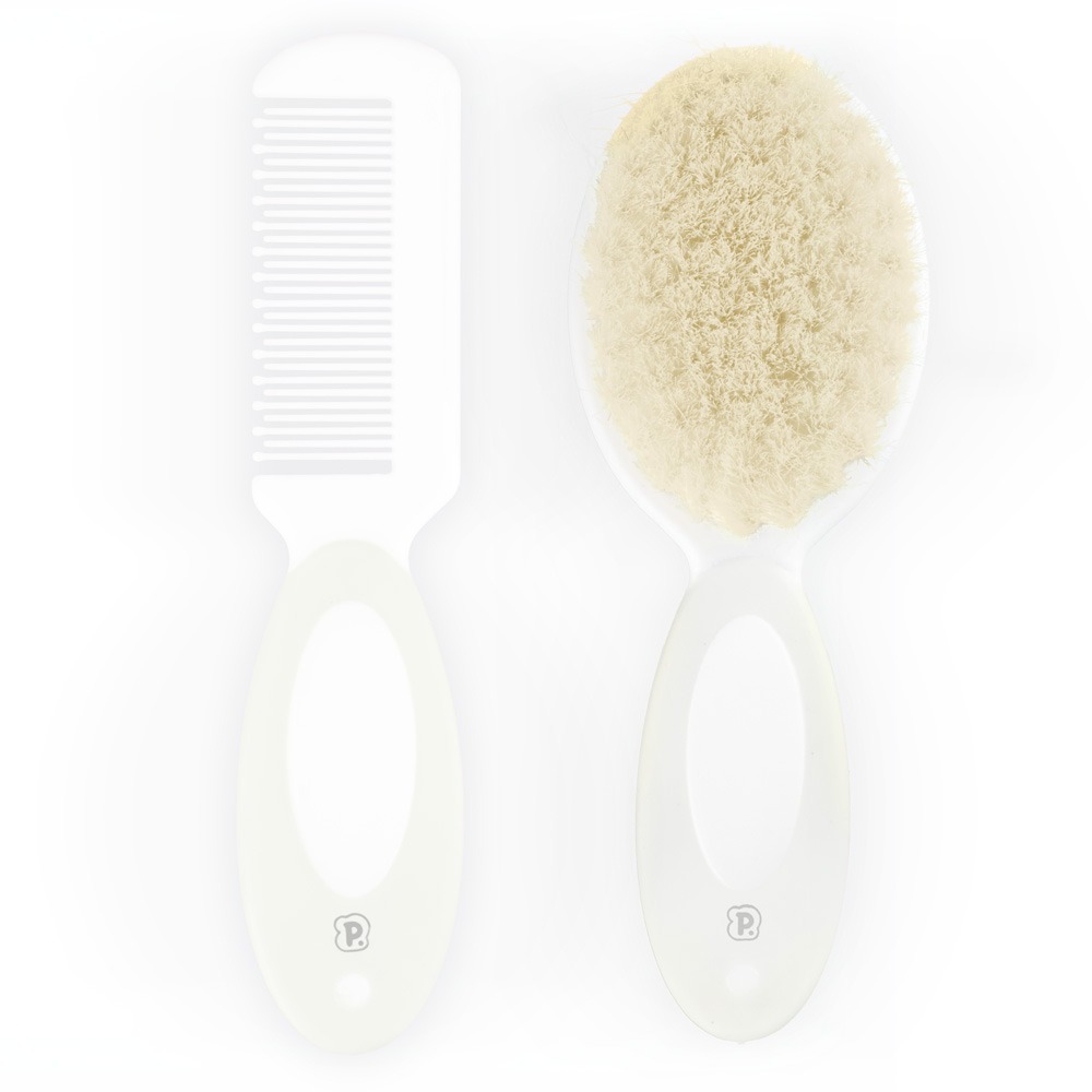 O kit é composto por uma escova de cerdas macias e naturais confeccionadas em lã, e um pente que auxiliam os cuidados do bebê na primeira infância. Seu cabo é emborrachado e antiderrapante.