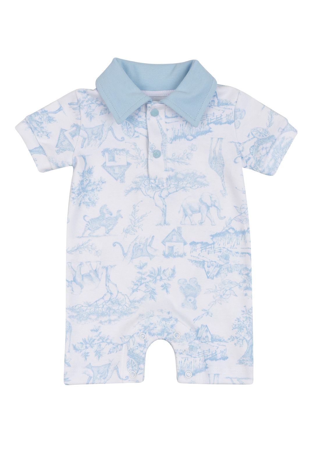 Macacão curto infantil na cor azul, com estampa delicada de fazenda. Confeccionado em tecido macio e confortável, é ideal para manter o bebê fresquinho e à vontade durante todo o dia. Prático e cheio de charme, perfeito para o dia a dia ou momentos especiais.