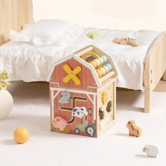 Com design lúdico e pintura suave, a fazendinha reúne diversas atividades em um único brinquedo: trilhas deslizantes com animais, moinho giratório, relógio de ponteiros, abas desafiadoras e um ábaco colorido no topo. Cada lado apresenta um novo estímulo, tornando a experiência dinâmica e repleta de aprendizados.