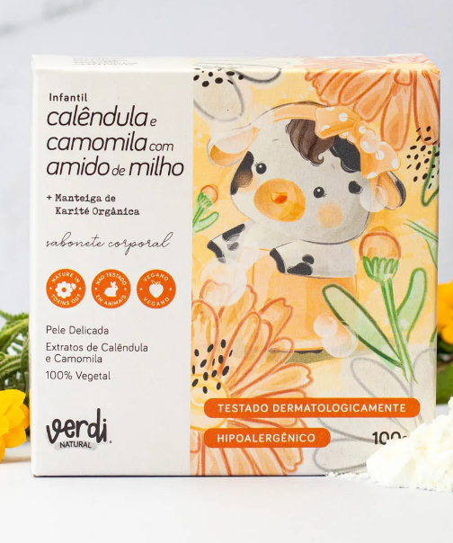 O Sabonete Corporal Infantil Calêndula, Camomila, Amido de Milho com Manteiga de Karité da Linha Infantil é um sabonete com propriedades emolientes e nutritivas, elaborado com base 100% vegetal,enriquecido com manteiga de karité e uma combinação de óleos essenciais. Desenvolvido para pele delicada da criança. Limpa delicadamente sem agredir a pele. É testado dermatologicamente e hipoalergênico.
